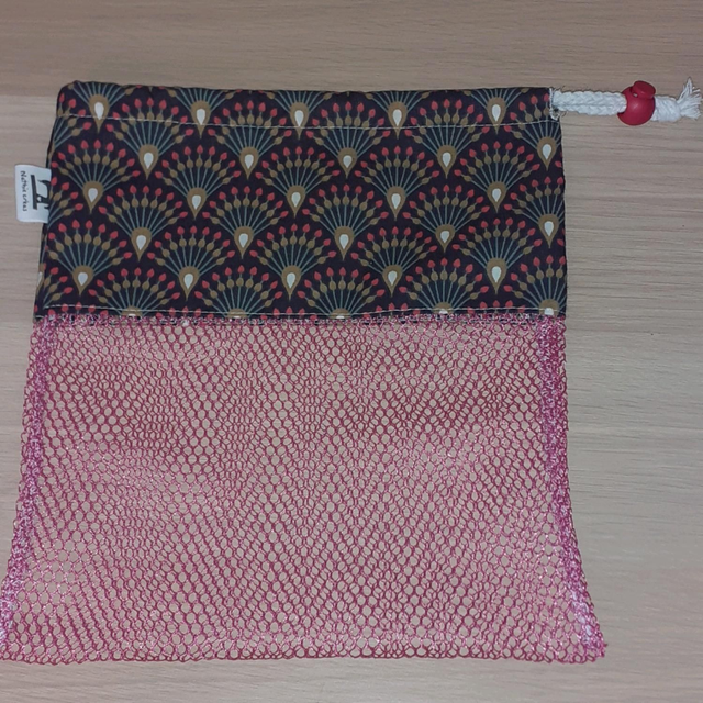 Une partie en coton, une partie filet mesh, un cordon en coton et un serre cordon pour le fermer correctement.